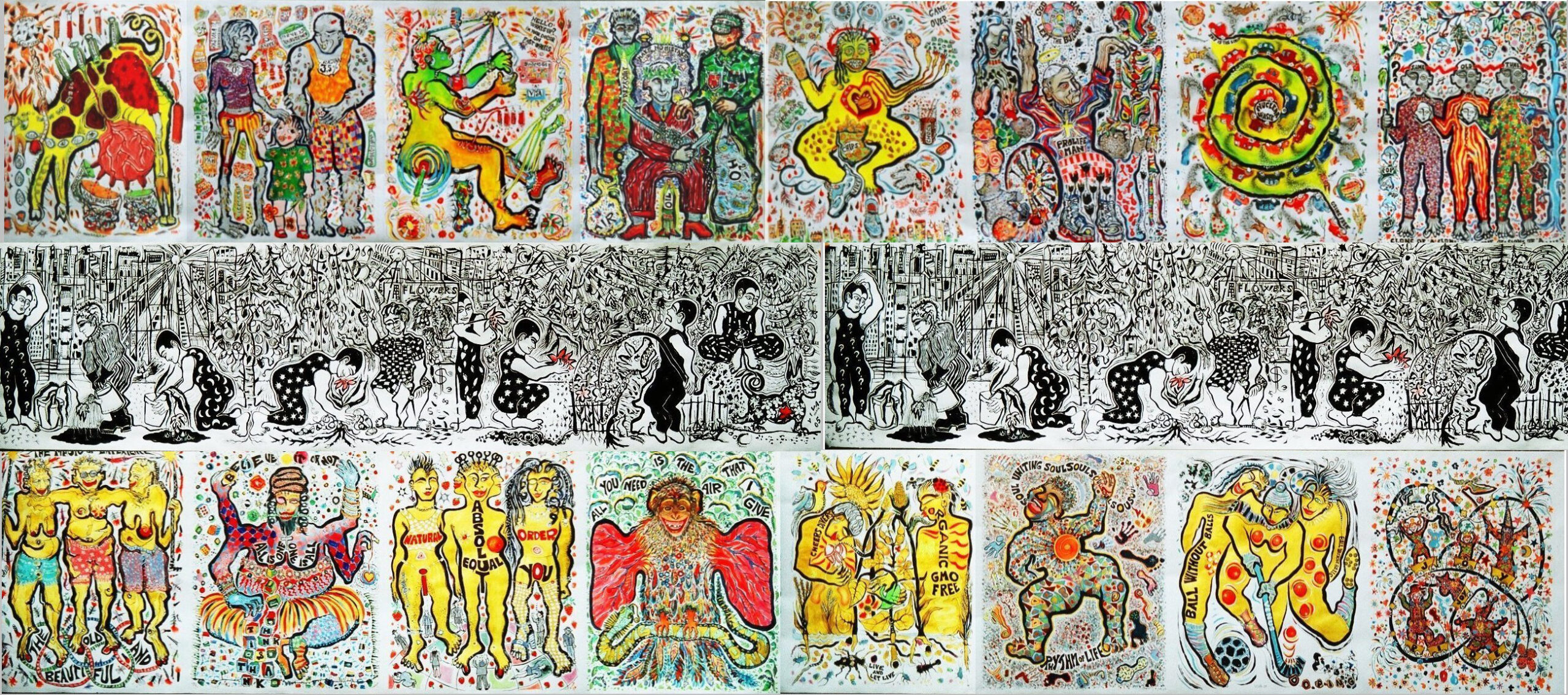JOYMIC 8 shows desirable developments in the world. Acrylic, markers and pencil on paper 1,5m X 10m.